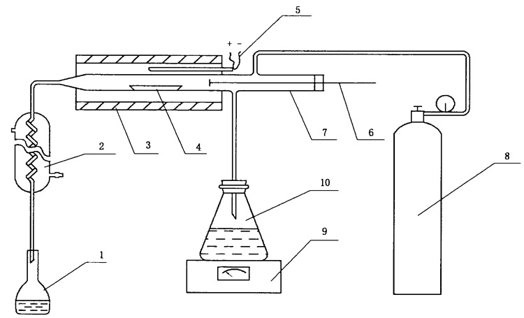 1-容量瓶;2-冷凝管;3-高溫爐;4-瓷舟;5-鉑銠一鉑熱電偶;6-進(jìn)樣推棒;7-燃燒管;8-氧氣鋼瓶;9-調(diào)溫電爐;10 -平底磨口燒瓶。 按圖所示裝配好全套儀器,連接好電路、氣路和水路各個(gè)系統(tǒng),將高溫爐升溫到1100℃。往燒瓶中加入約300 mL水并加熱至沸騰,冷凝管通入冷水。塞緊進(jìn)樣推棒硅膠塞,在平底燒瓶中水沸騰之前通人氧氣,調(diào)節(jié)氧氣流量為400 mL/min,檢查系統(tǒng)不漏氣后,通入水蒸氣和氧氣空蒸15 min。 操作試驗(yàn)步驟 稱取(0.50±0.01)g 一般分析試驗(yàn)煤樣(稱準(zhǔn)至0.1 mg)和0.5 g石英砂放在瓷舟里小心混合均勻,再用約0.5 g石英砂鋪蓋在上面。將100 mL容量瓶放在冷凝管下端接收冷凝液。取下進(jìn)樣推桿,把瓷舟放入燃燒管內(nèi),插入進(jìn)樣推桿,塞緊硅膠塞。將瓷舟的前端推到預(yù)先測(cè)好的約300℃區(qū)域停留5 分鐘,接著推進(jìn)到約600℃區(qū)停留5分鐘,再推進(jìn)到約900℃區(qū)停留5分鐘,最后把瓷舟推到1100℃的恒溫區(qū),拔出進(jìn)樣推桿以免融化,樣品在恒溫區(qū)繼續(xù)燃燒分解15分鐘。在整個(gè)操作過程中,調(diào)節(jié)燒杯內(nèi)水的蒸發(fā)量,水解開始15分鐘內(nèi),容量瓶中每分鐘收集約3mL,后15分鐘,每分鐘收集約2.5 mL,最后總體積應(yīng)控制在85 mL以內(nèi)。燃燒-水解完成后,移走容量瓶。停止通氧氣,取下送樣推棒,取出燃燒舟。 測(cè)量電位 在100 mL燒杯中加入一定量的水,連接好電位測(cè)量裝置,開動(dòng)攪拌器,更換燒杯中水?dāng)?shù)次,直至毫伏計(jì)顯示的電位值達(dá)到氟電極的空白電位。 在5個(gè)用水沖洗過的100 mL容量瓶中,分別加入100 ug/mL的氟標(biāo)準(zhǔn)工作溶液1 mL,3 mL,5mL,7 mL,10 mL,加入3滴溴甲酚綠指示劑,10 mL總離子強(qiáng)度調(diào)節(jié)緩沖溶液,用水稀釋到刻度,搖勻,靜置30分鐘。 計(jì)算結(jié)果: 煤中氟的含量(Fad)按下面公式)計(jì)算,測(cè)定結(jié)果修約到個(gè)位。